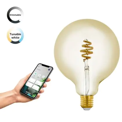 Die Eglo Connect.Z Smart LED Globe E27 Fadenlampe Messing 4.9W 360lm - 827-865 Abstimmbares Weiß | Dimmbar - Ersatz Für 25W ist eine effiziente E27 LED-Lampe mit Retrodesign und der perfekte Ersatz für Ihre konventionellen 25W Lampen mit E27. Zudem strahlt sie Licht in der Farbtemperatur 2700K - 6500K Tunable White aus und punktet durch eine lange Lebensdauer.