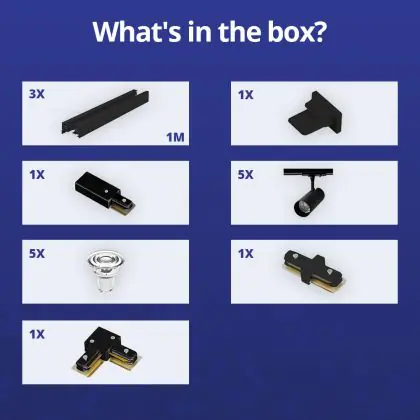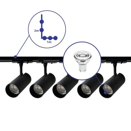 Beschreibung Komplettset 1-Phasen Rail L 1 x 2 Meter Schwarz | incl. 5x Spot + GU10 2700K 3W Dimmbar + Abschlusskappe, Stromanschluss und L -Verbinder