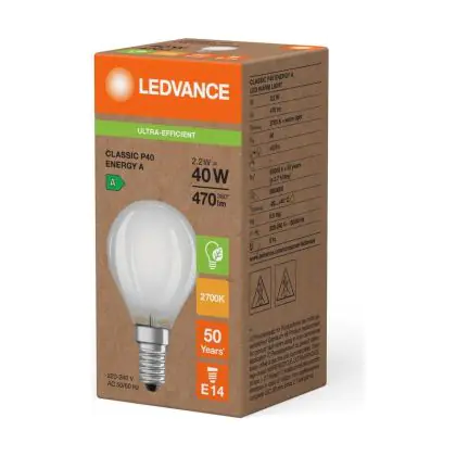 Die Ledvance LED Classic E14 Birne Fadenlampe Matt 2.2W 470lm - 827 Extra Warmweiß | Ersatz Für 40W ist eine effiziente E14 LED-Lampe mit Retrodesign und der perfekte Ersatz für Ihre konventionellen 40W Lampen mit E14. Zudem strahlt sie Licht in der Farbtemperatur 2700K - Extra Warmweiß aus und punktet durch eine lange Lebensdauer.