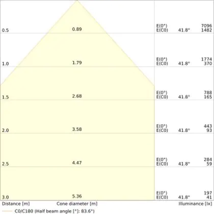 Beispiel: Wird eine Lampe mit einem Abstrahlwinkel von 60 Grad an der Decke (2,5 m Höhe) angebracht, erzeugt sie einen Lichtkegel von 2,9 Metern Durchmesser. Hat die Lampe hingegen einen Abstrahlwinkel von 120 Grad, beträgt der Lichtkegel 8,7 Meter im Durchmesser. |
