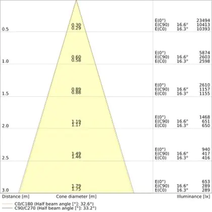 Beispiel: Wird eine Lampe mit einem Abstrahlwinkel von 60 Grad an der Decke (2,5 m Höhe) angebracht, erzeugt sie einen Lichtkegel von 2,9 Metern Durchmesser. Hat die Lampe hingegen einen Abstrahlwinkel von 120 Grad, beträgt der Lichtkegel 8,7 Meter im Durchmesser. |