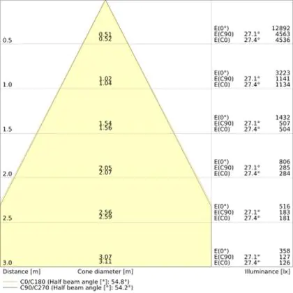 Beispiel: Wird eine Lampe mit einem Abstrahlwinkel von 60 Grad an der Decke (2,5 m Höhe) angebracht, erzeugt sie einen Lichtkegel von 2,9 Metern Durchmesser. Hat die Lampe hingegen einen Abstrahlwinkel von 120 Grad, beträgt der Lichtkegel 8,7 Meter im Durchmesser. |