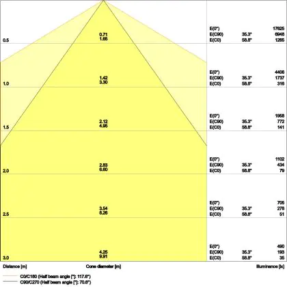 Beispiel: Wird eine Lampe mit einem Abstrahlwinkel von 60 Grad an der Decke (2,5 m Höhe) angebracht, erzeugt sie einen Lichtkegel von 2,9 Metern Durchmesser. Hat die Lampe hingegen einen Abstrahlwinkel von 120 Grad, beträgt der Lichtkegel 8,7 Meter im Durchmesser. |
